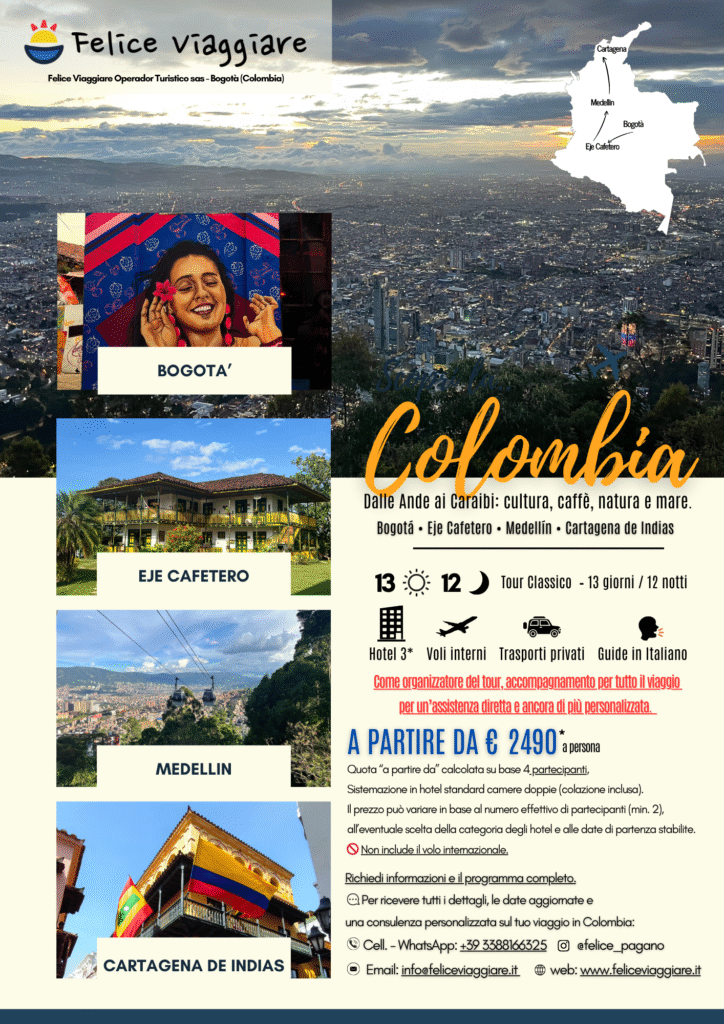Un viaggio pensato per scoprire la vera essenza della Colombia, tra città vibranti, villaggi pittoreschi e meraviglie naturali, accompagnato da guide esperte in lingua italiana, comfort privati e un’assistenza personalizzata in ogni tappa con accompagnamento in italiano.